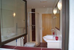 De moderne badkamer is voorzien van een douchecabine, toilet en een grote spiegel.